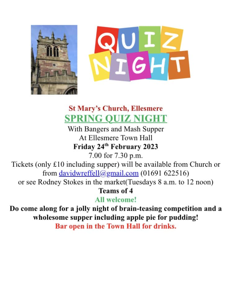 St Mary’s Church Ellesmere – Spring Quiz Night 24th February 2023Quiz NightFebruary 22, 2023Read News Article