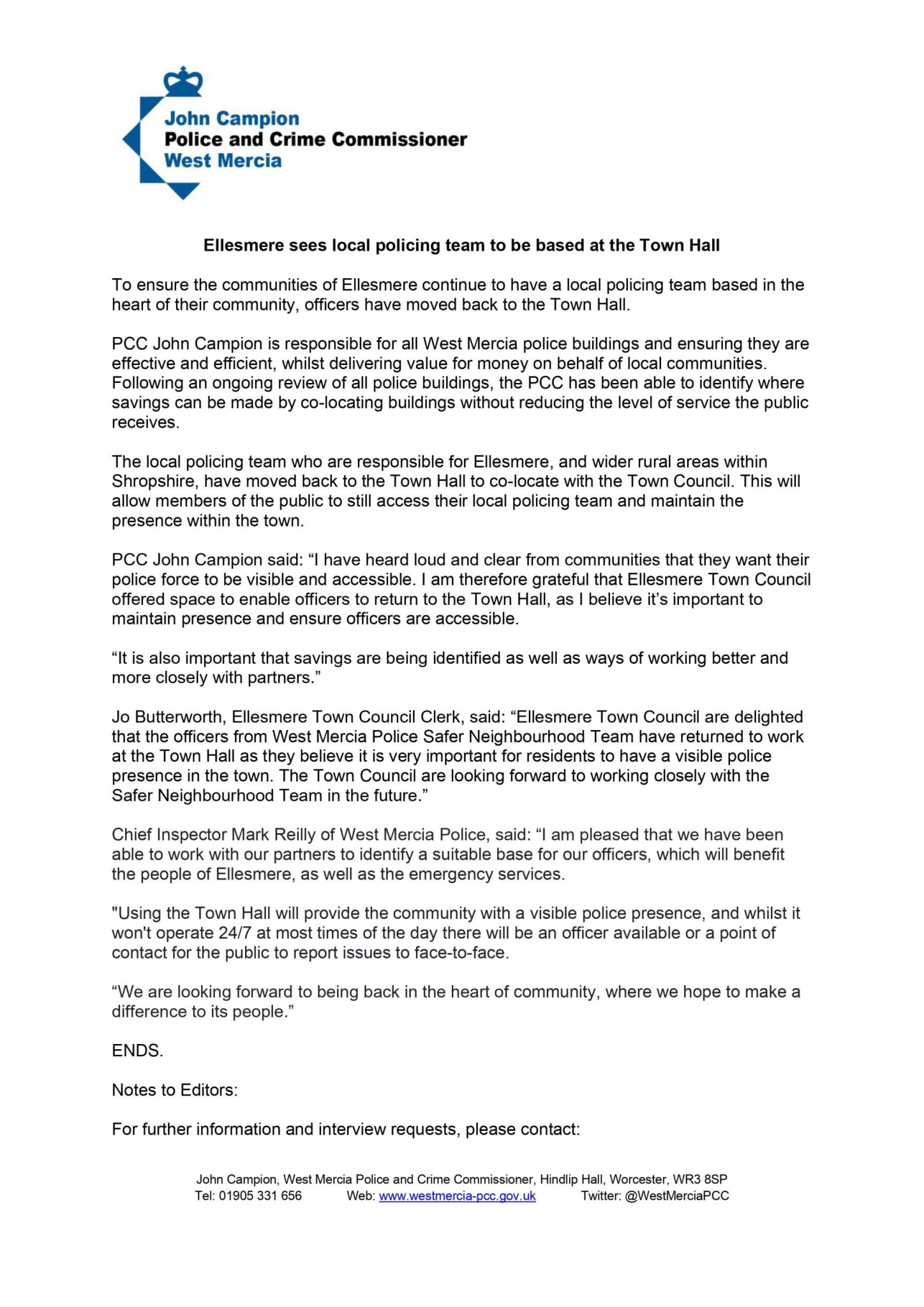 Ellesmere sees local policing team to be based at the Town HallEllesmere – 041122November 7, 2022Read News Article