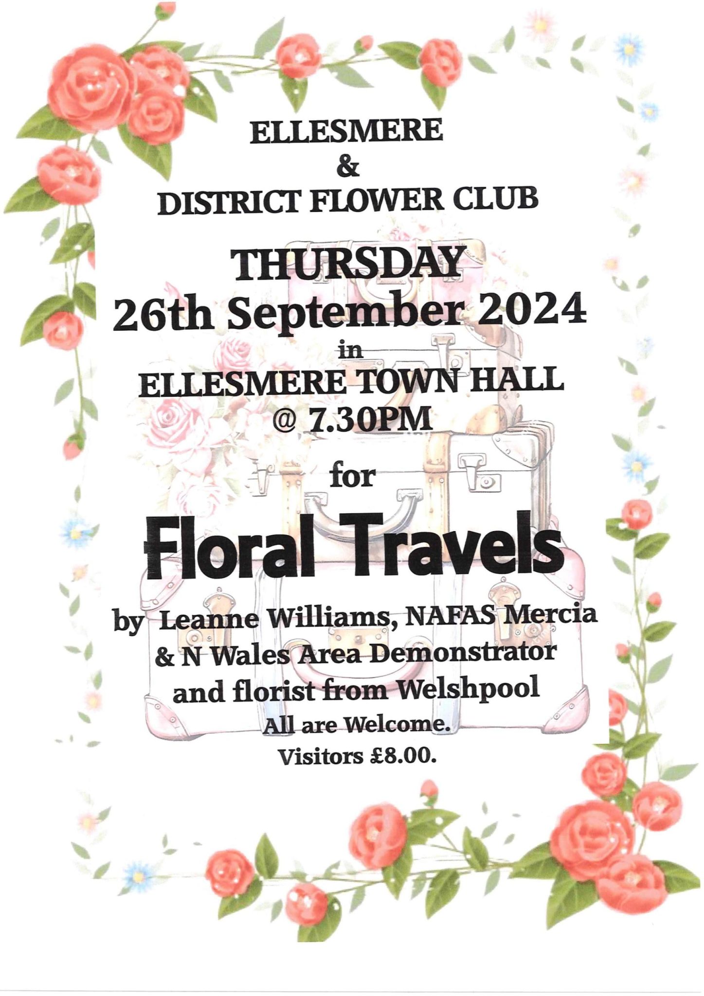 Ellesmere & District Flower Club – 26th September 2024Ellesmere Town Hall 7.30pm Floral Travels by Leanne Williams All welcome. £8.00 entry fee for visitorsAugust 19, 2024Read News Article